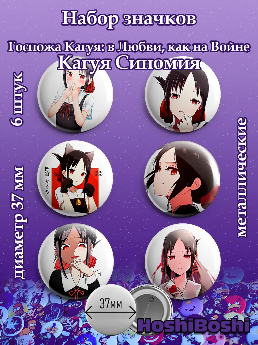 Набор из 6 металлических значков с изображениями из аниме Госпожа Кагуя: в любви, как на войне ( Kaguya-sama wa Kokurasetai: Tensai-tachi no Renai Zunousen ).