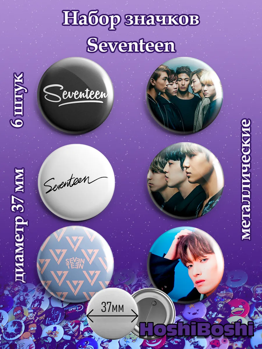 Набор из 6 металлических значков с изображениями Кей-Поп группы Севентин ( Seventeen ).