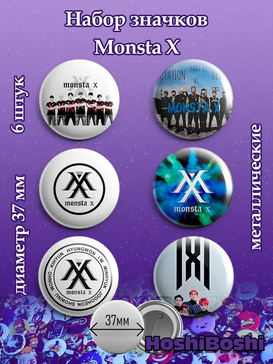 Набор из 6 металлических значков с изображениями с Кей-Поп группой Монста Икс ( Monsta X ).