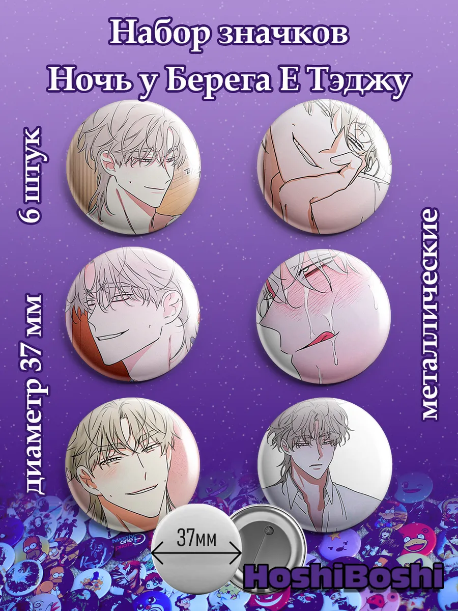 Набор из 6 металлических значков с изображениями из манхвы Ночь у Берега ( Waterside Night ).