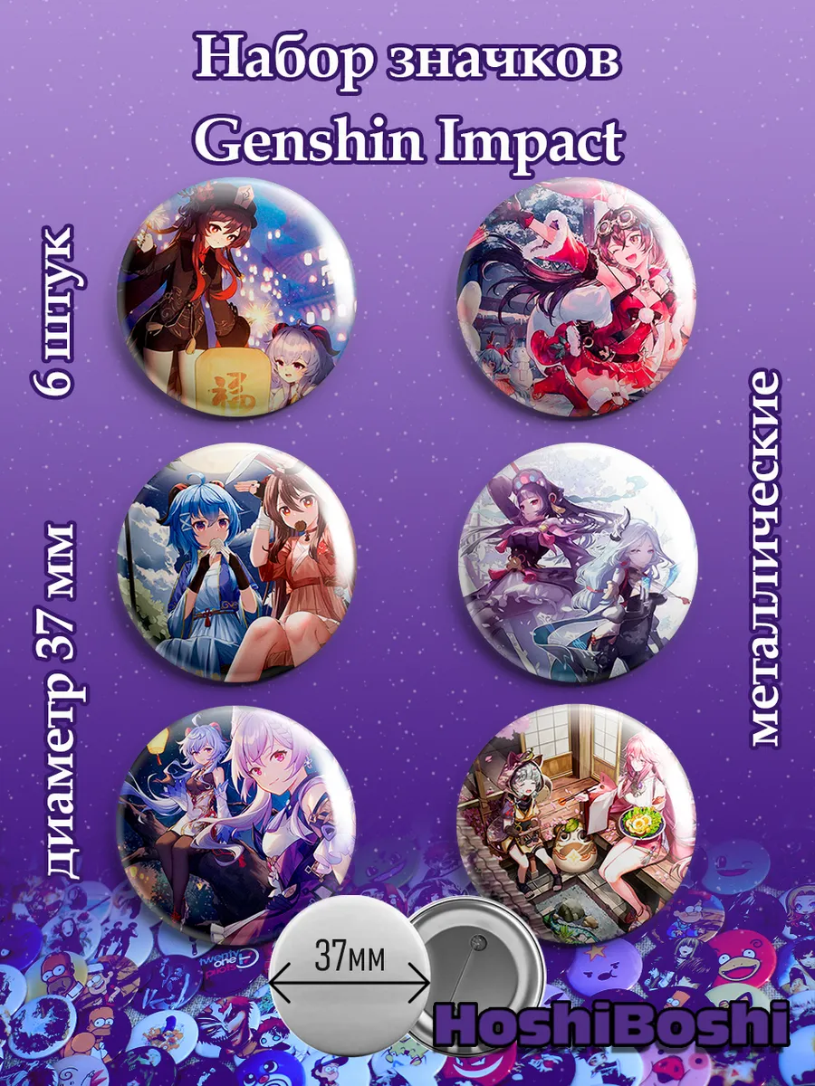 Набор из 6 металлических значков с изображениями из игры Геншин Импакт ( Genshin Impact ).