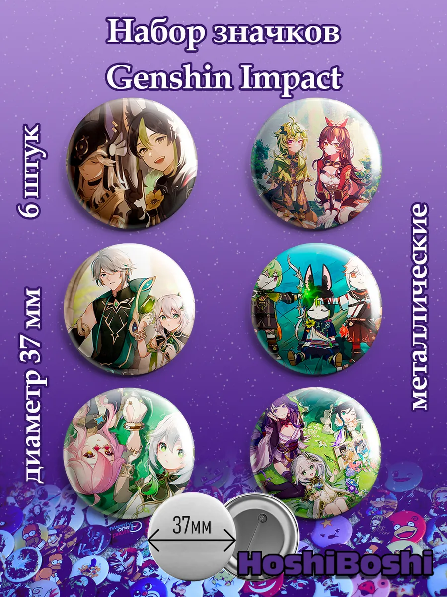 Набор из 6 металлических значков с изображениями из игры Геншин Импакт ( Genshin Impact ).