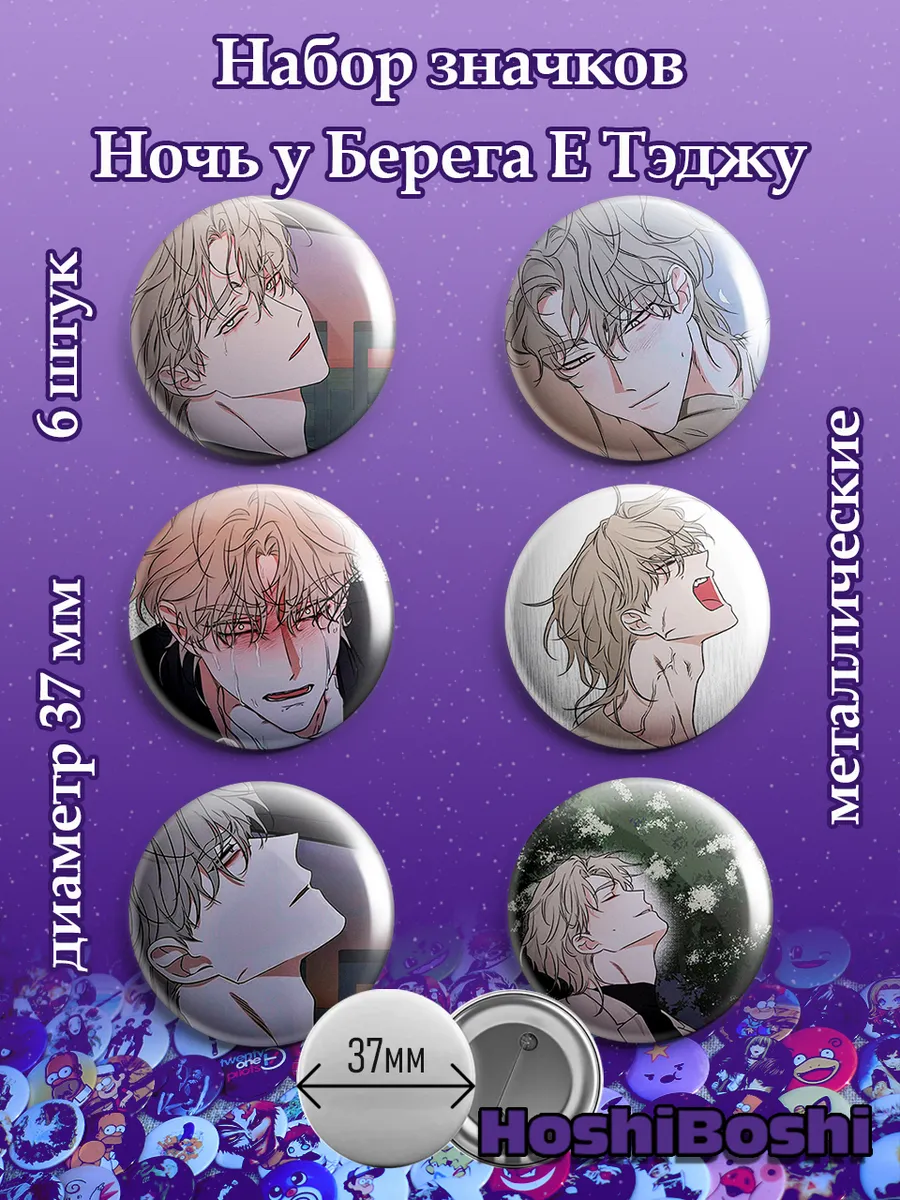 Набор из 6 металлических значков с изображениями из манхвы Ночь у Берега ( Waterside Night ).