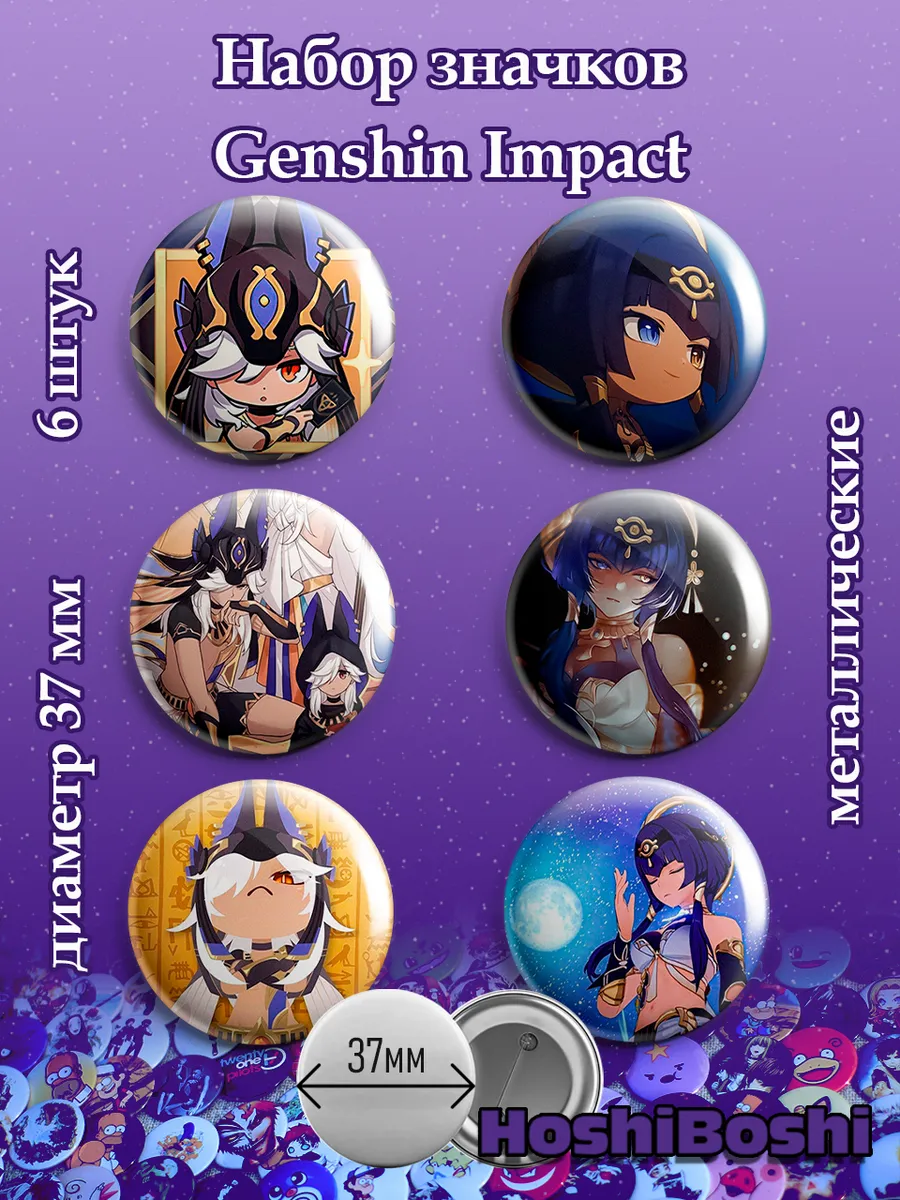 Набор из 6 металлических значков с изображениями из игры Геншин Импакт ( Genshin Impact ).