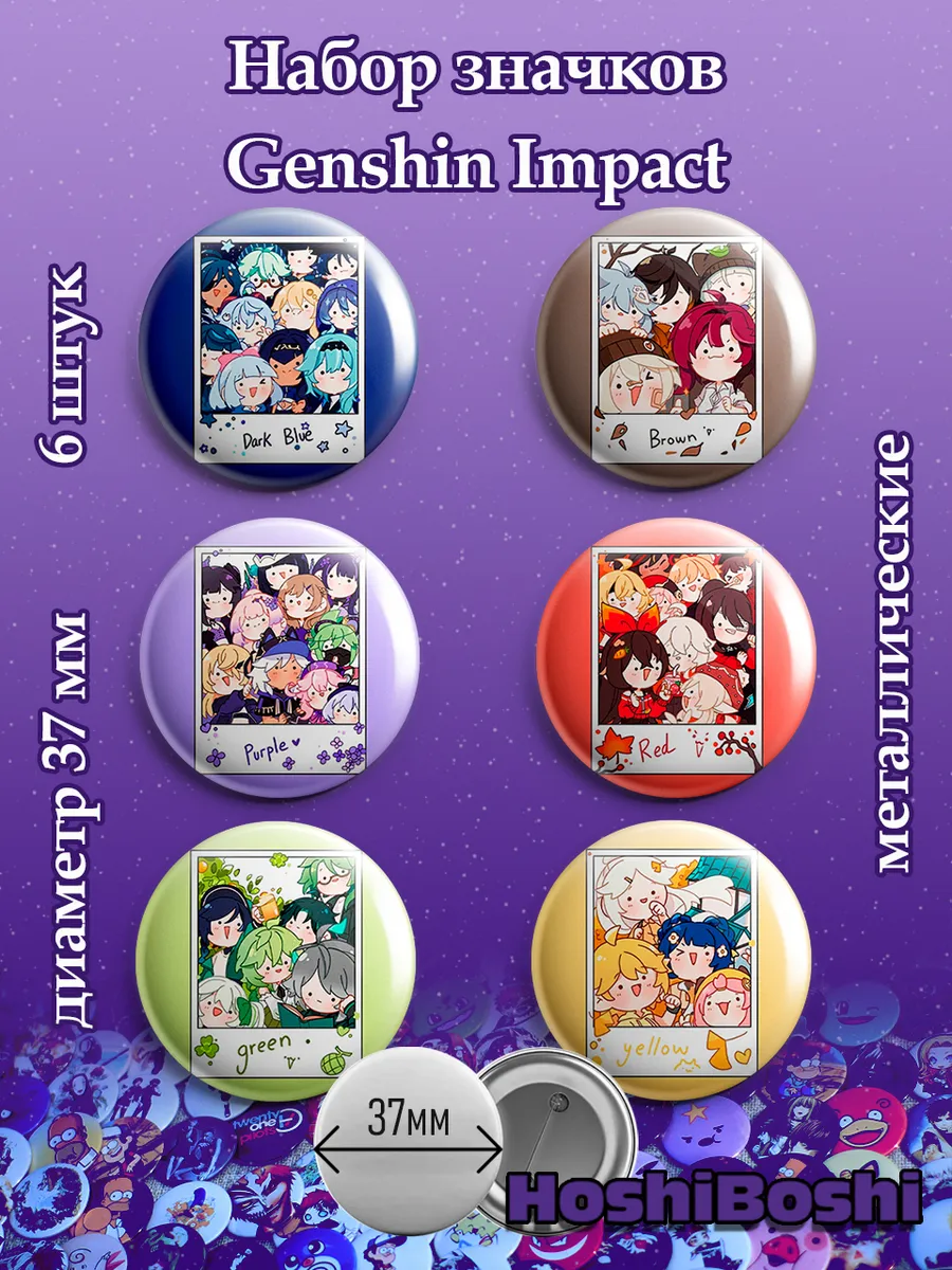 Набор из 6 металлических значков с изображениями из игры Геншин Импакт ( Genshin Impact ).