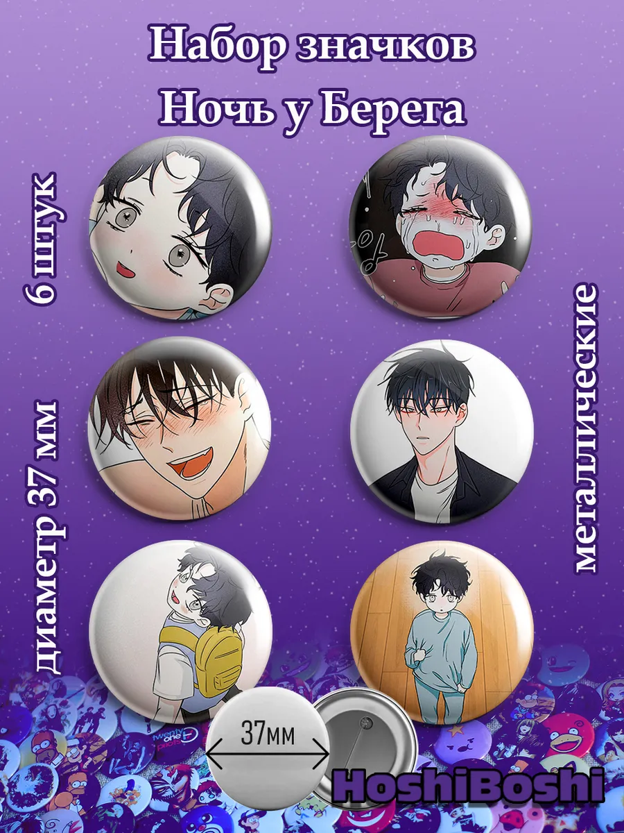 Набор из 6 металлических значков с изображениями из манхвы Ночь у Берега ( Waterside Night ).