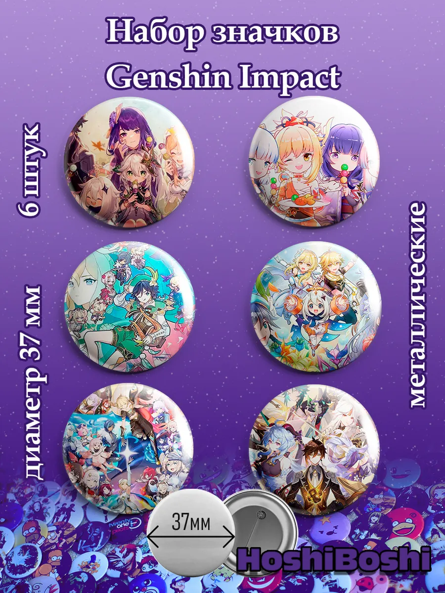 Набор из 6 металлических значков с изображениями из игры Геншин Импакт ( Genshin Impact ).