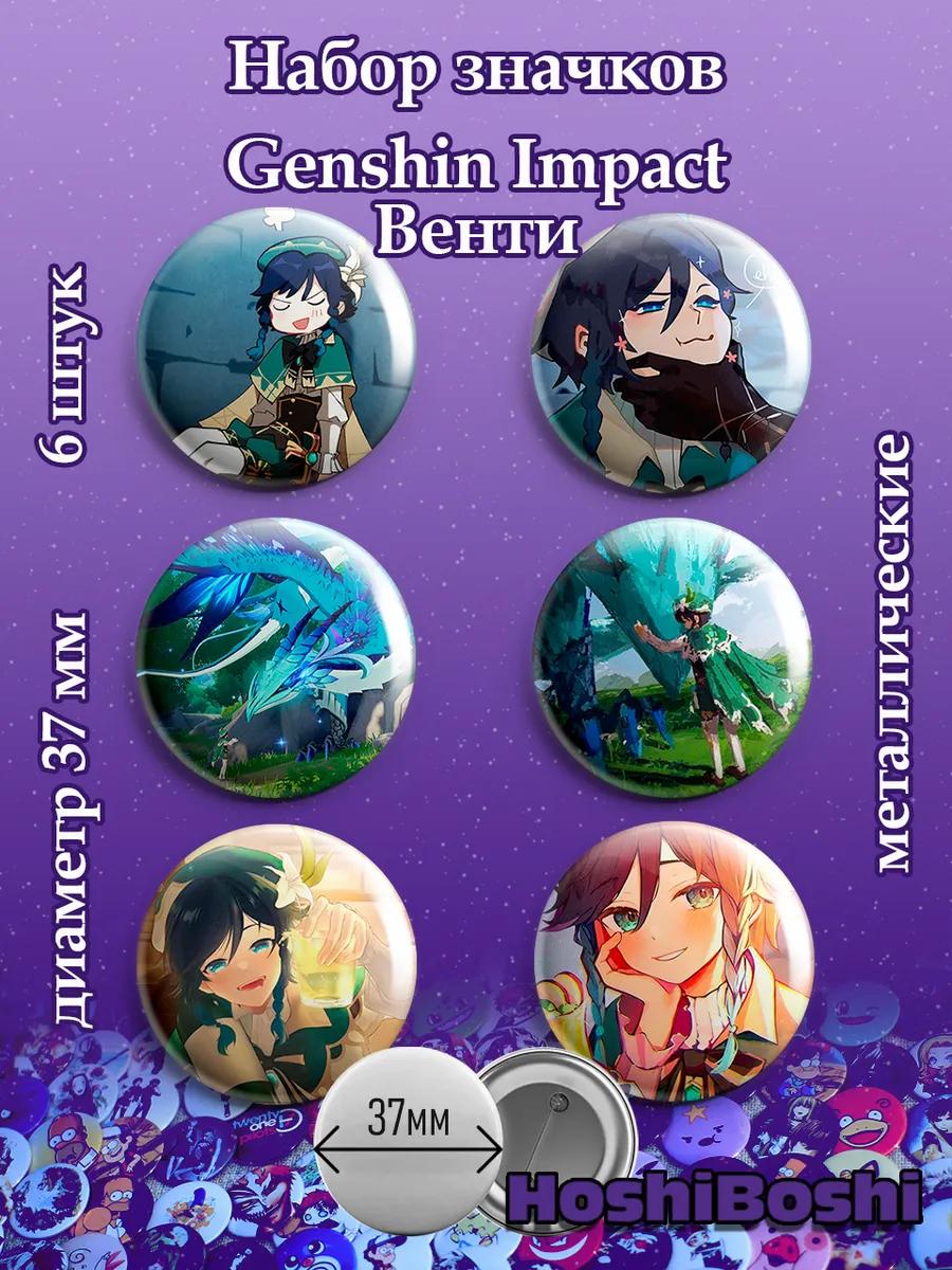 Набор из 6 металлических значков с изображениями из игры Геншин Импакт ( Genshin Impact ).