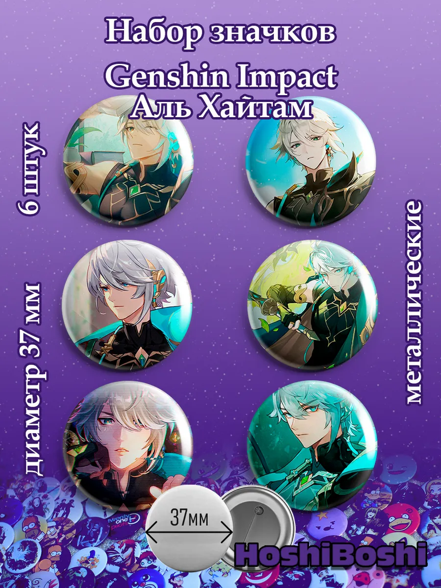 Набор из 6 металлических значков с изображениями из игры Геншин Импакт ( Genshin Impact ).