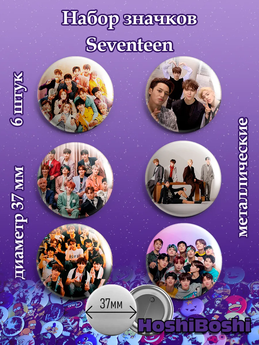 Набор из 6 металлических значков с изображениями Кей-Поп группы Севентин ( Seventeen ).