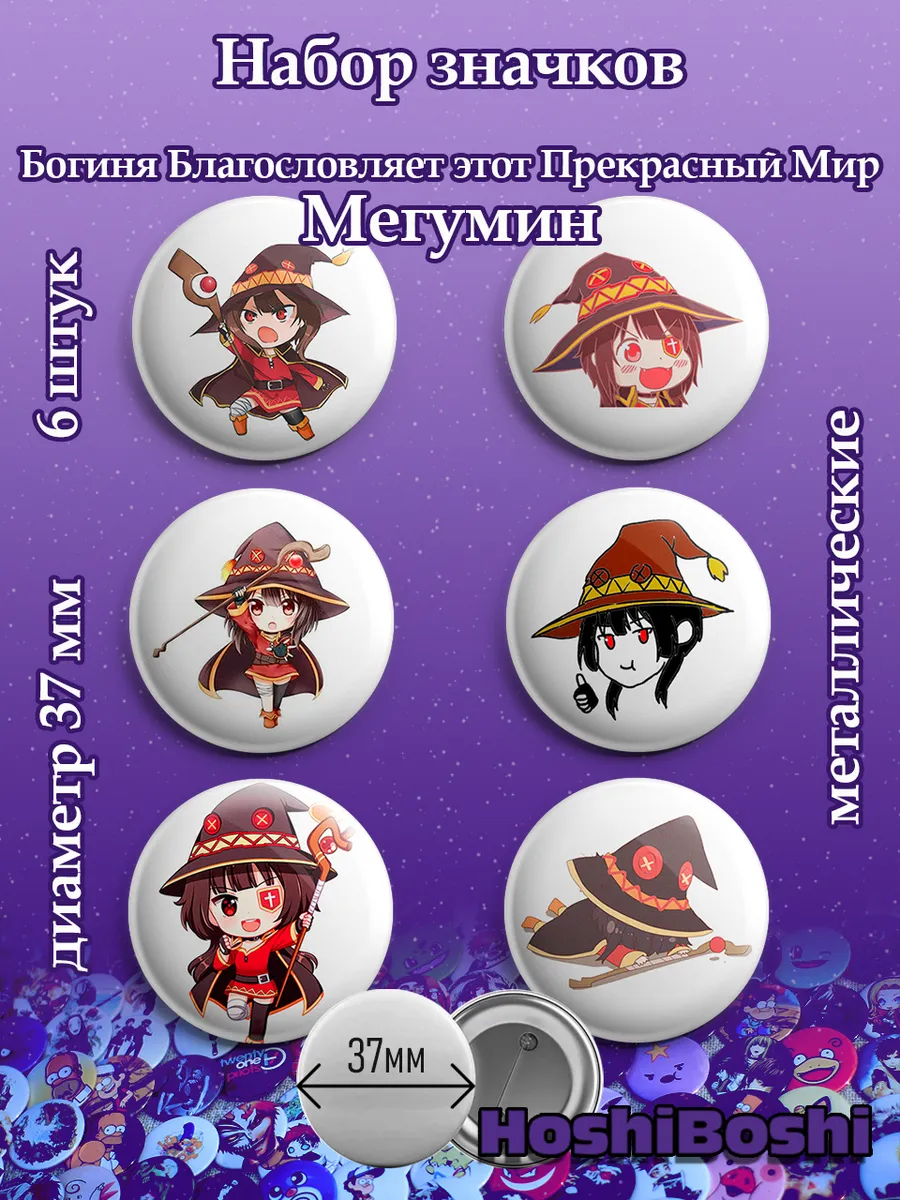 Набор из 6 металлических значков с изображениями из аниме Богиня благословляет этот замечательный мир Коносуба ( Kono Subarashii Sekai ni Shukufuku wo! KonoSuba ).