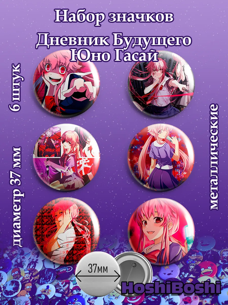 Набор из 6 металлических значков с изображениями из аниме Дневник Будущего ( Future Diary Mirai Nikki ).