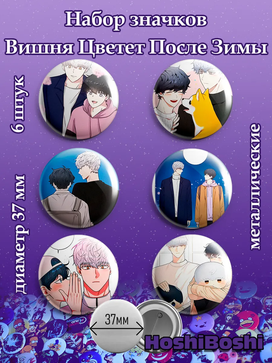 Набор из 6 металлических значков с изображениями из манхвы Вишня Цветет после Зимы ( Cherry Blossoms After Winter ).
