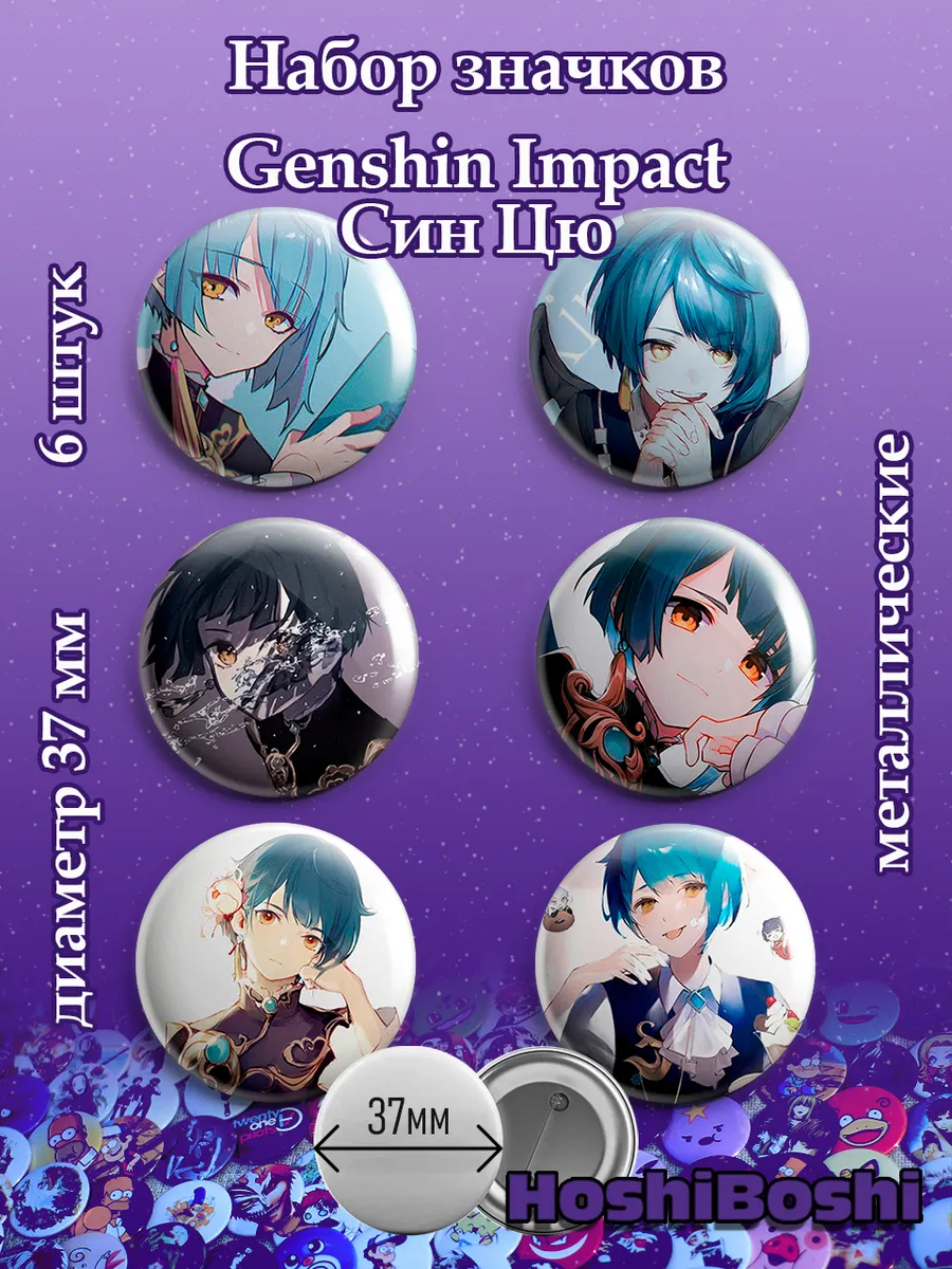 Набор из 6 металлических значков с изображениями из игры Геншин Импакт ( Genshin Impact ).