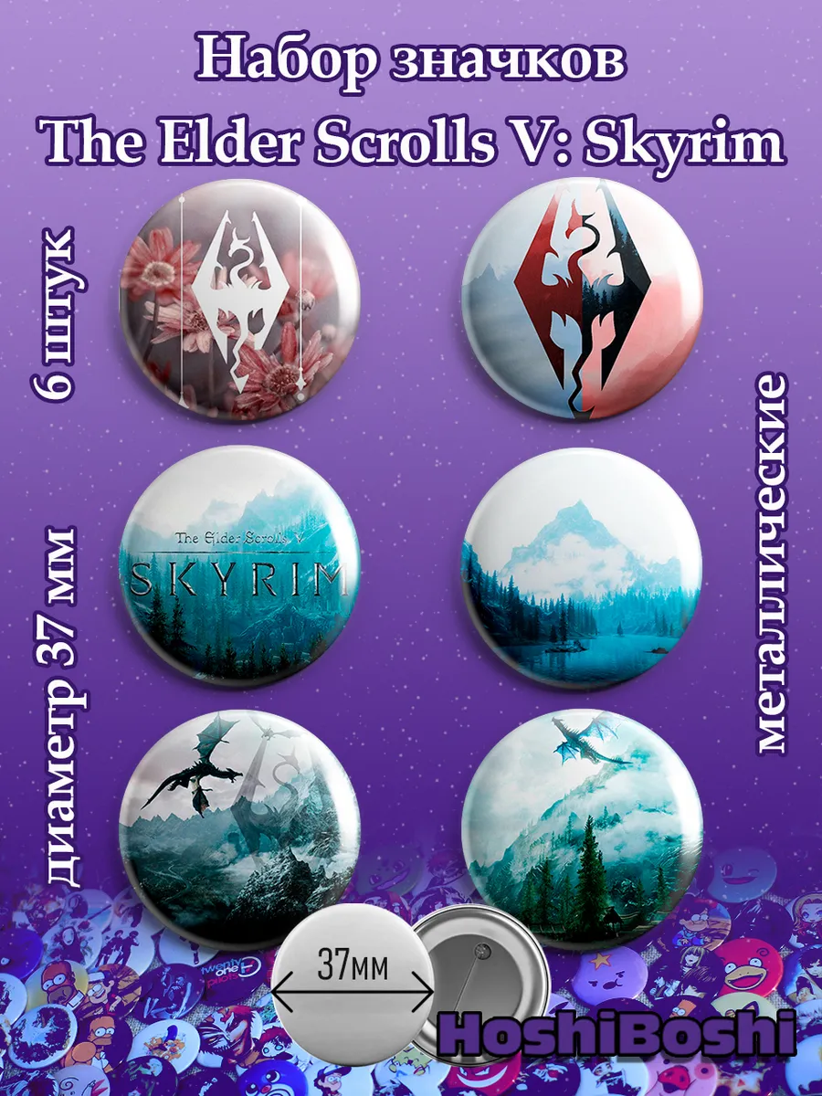 Набор из 6 металлических значков с изображениями из игры Скайрим ( The Elder Scrolls V: Skyrim ).