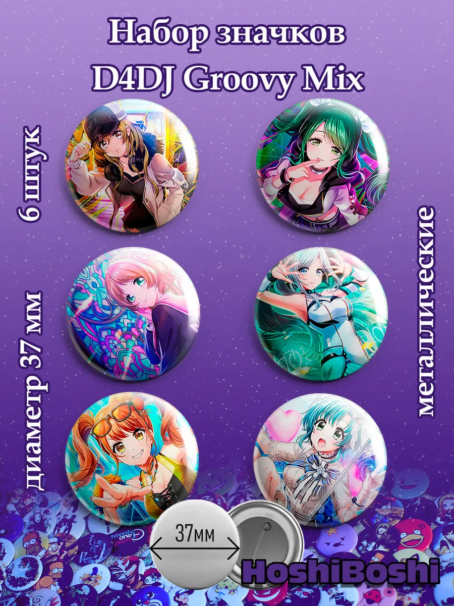 Набор из 6 металлических значков с изображениями из игры D4DJ Заводная Смесь ( D4DJ Groovy Mix ).