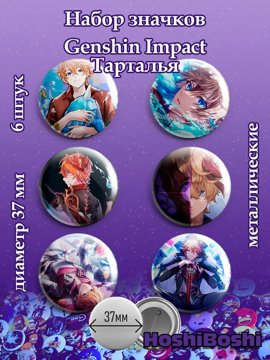 Набор из 6 металлических значков с изображениями из игры Геншин Импакт ( Genshin Impact ).