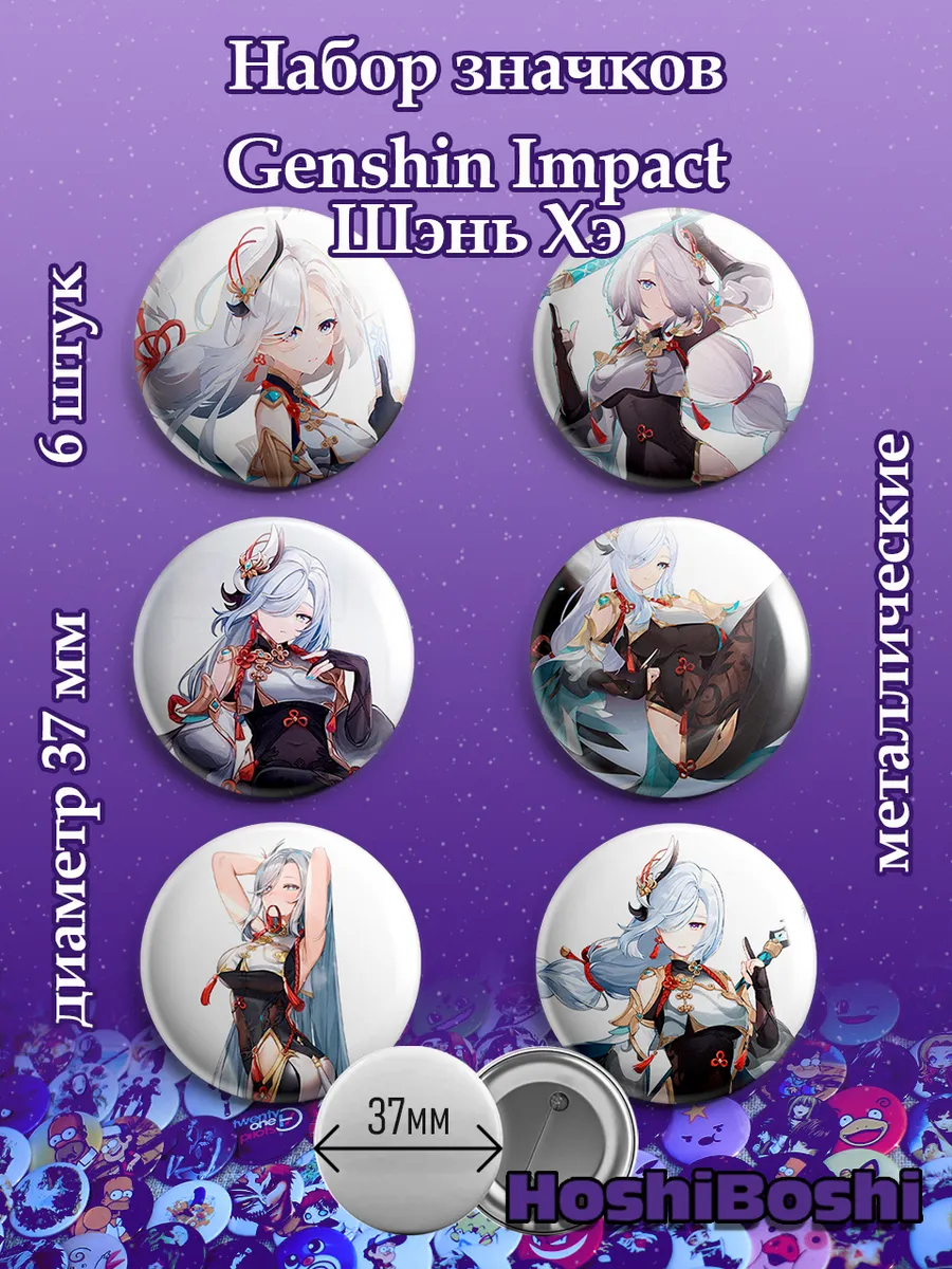 Набор из 6 металлических значков с изображениями из игры Геншин Импакт ( Genshin Impact ).
