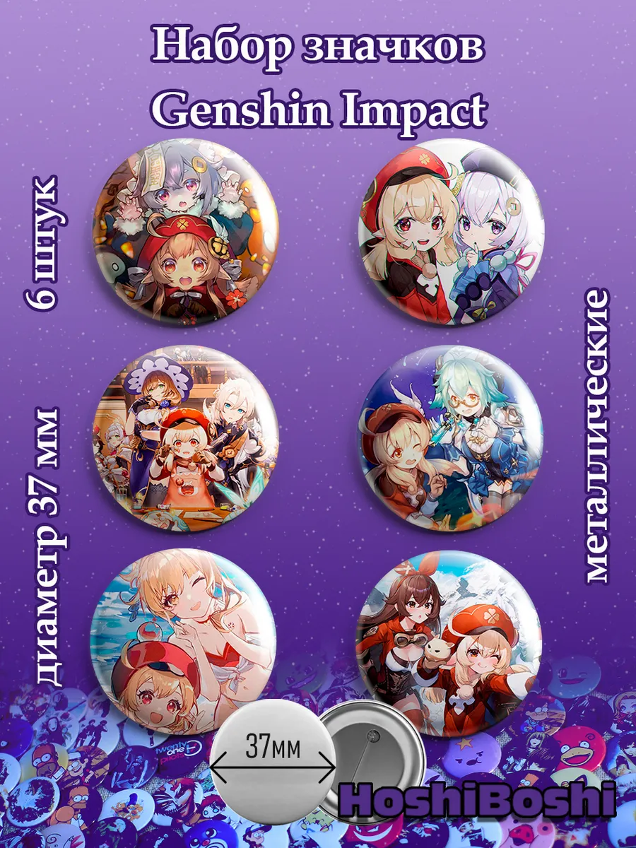 Набор из 6 металлических значков с изображениями из игры Геншин Импакт ( Genshin Impact ).