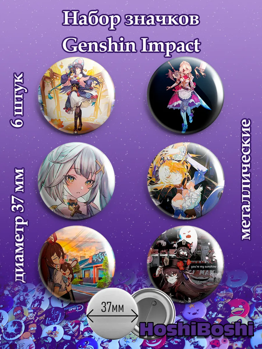 Набор из 6 металлических значков с изображениями из игры Геншин Импакт ( Genshin Impact ).