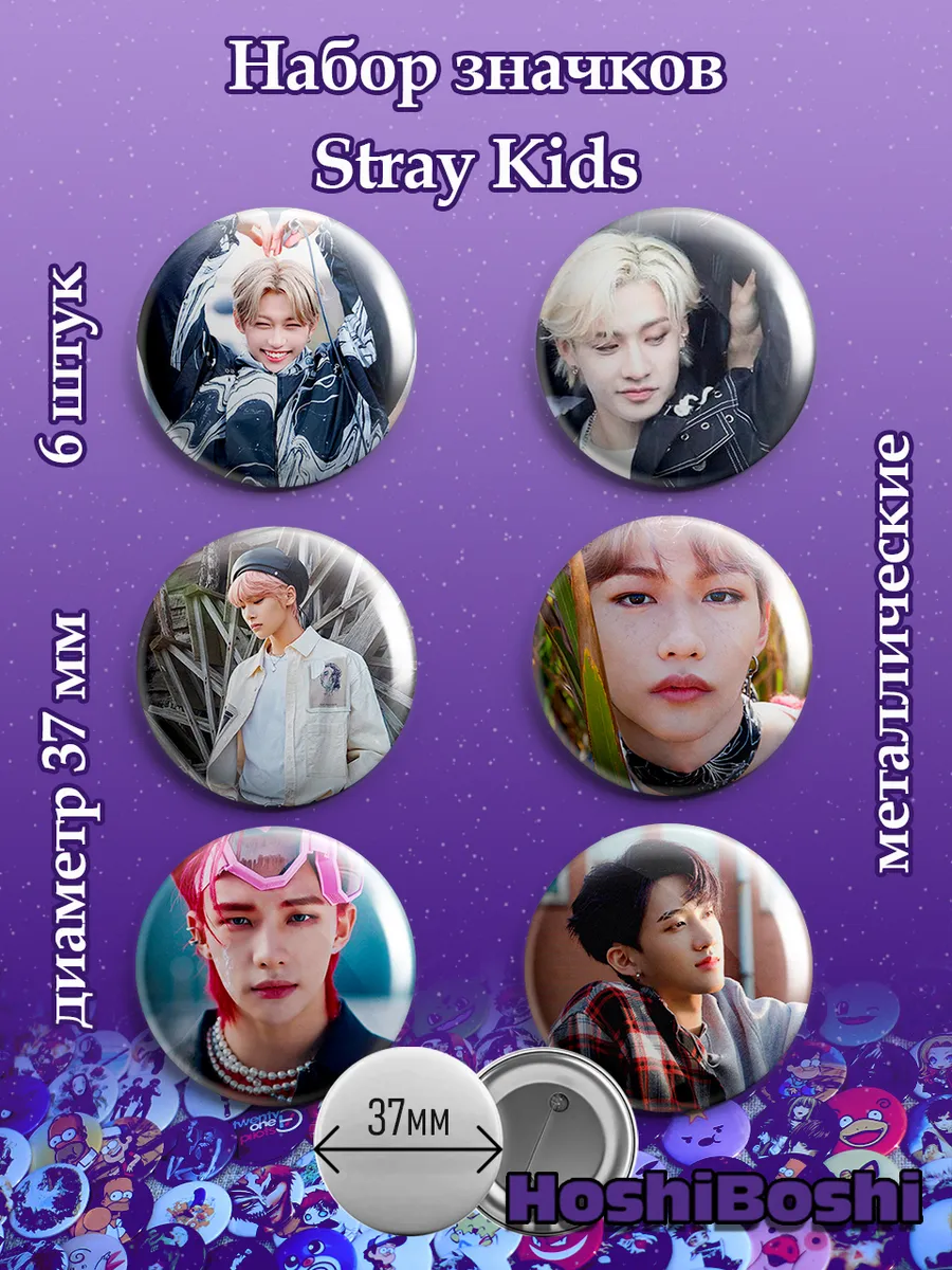 Набор из 6 металлических значков с изображениями Кей-поп группы Стрэй Кидс ( Stray Kids ).