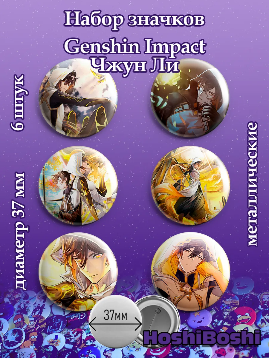 Набор из 6 металлических значков с изображениями из игры Геншин Импакт ( Genshin Impact ).