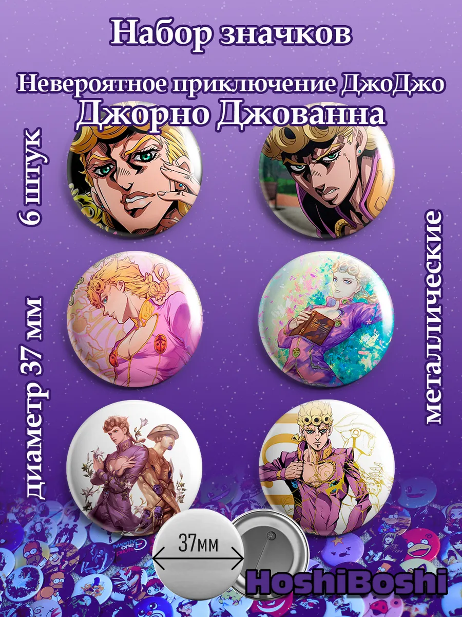 Набор из 6 металлических значков с изображениями из аниме Невероятные Приключения Джо Джо ( JoJo's Bizarre Adventure ).