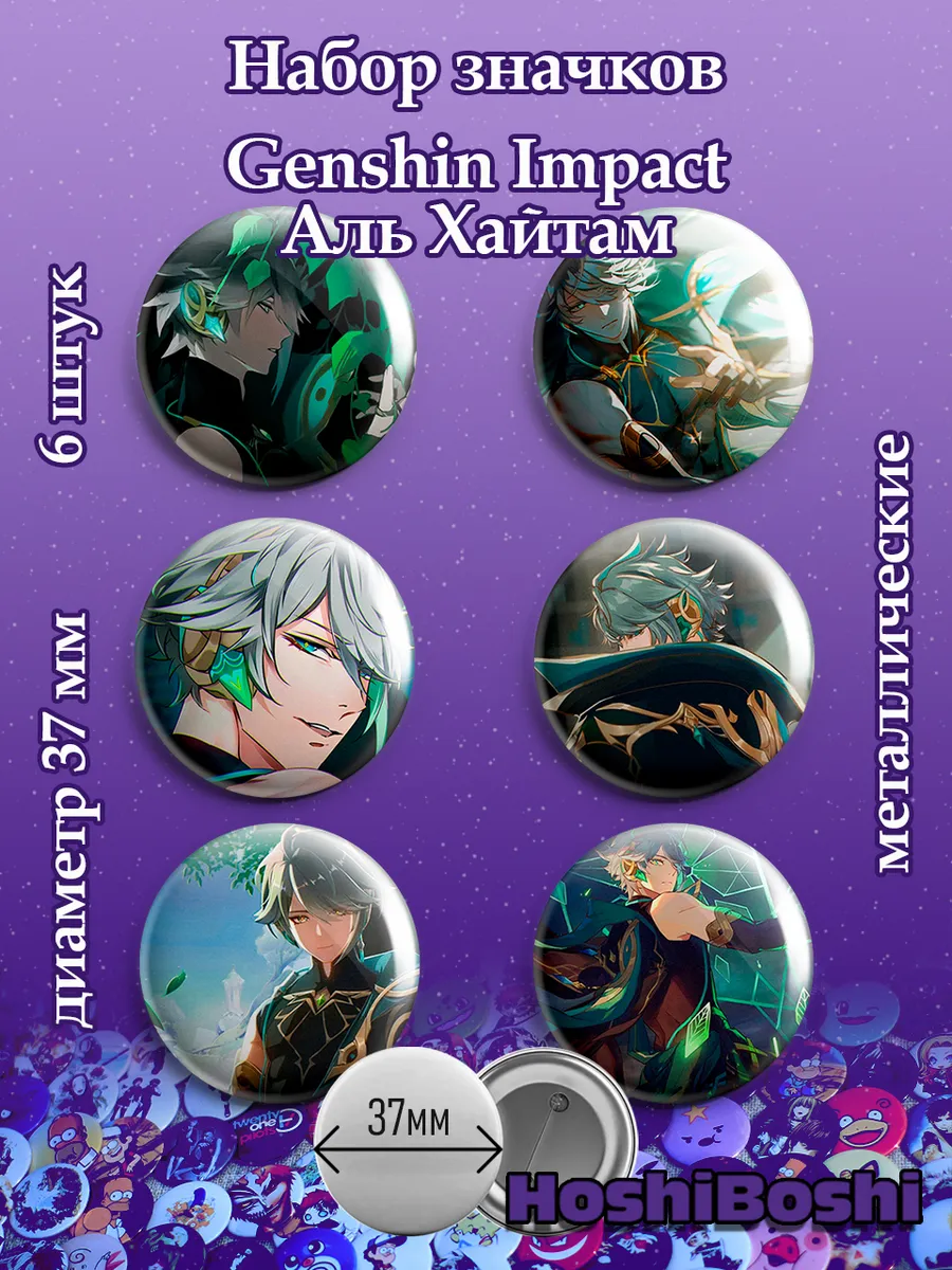 Набор из 6 металлических значков с изображениями из игры Геншин Импакт ( Genshin Impact ).