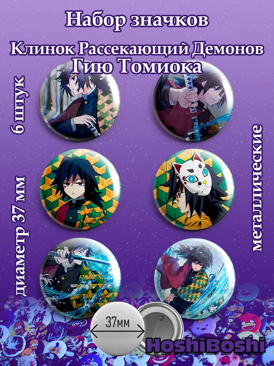 Набор из 6 металлических значков с изображениями из аниме Клинок Рассекающий Демонов ( Demon Slayer: Kimetsu no Yaiba ).
