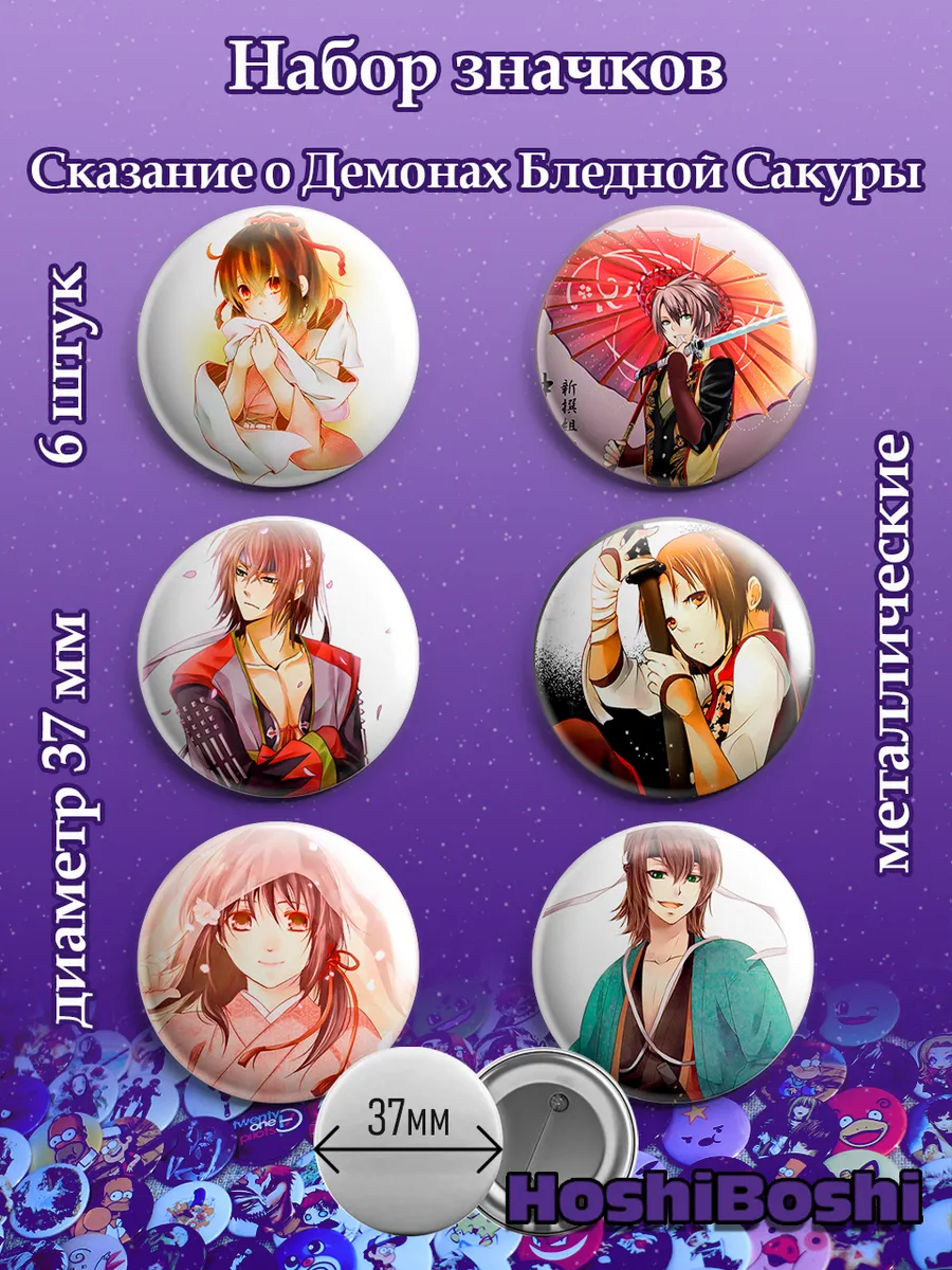 Набор из 6 металлических значков с изображениями из аниме Сказание о Демонах Бледной Сакуры ( Hakuouki ).