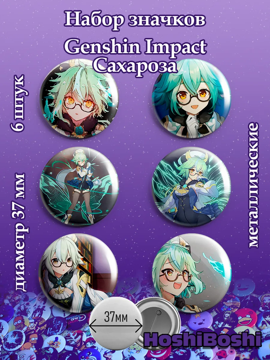 Набор из 6 металлических значков с изображениями из игры Геншин Импакт ( Genshin Impact ).