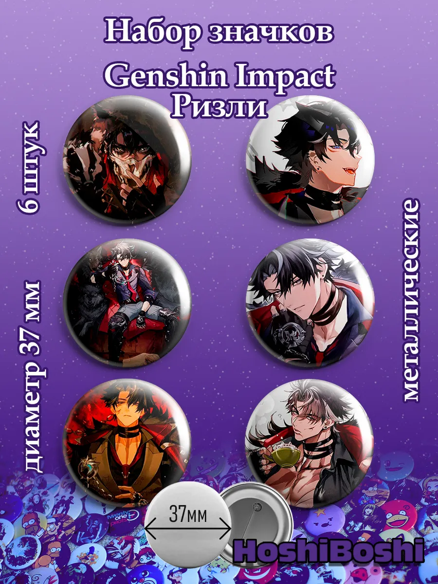 Набор из 6 металлических значков с изображениями из игры Геншин Импакт ( Genshin Impact ).