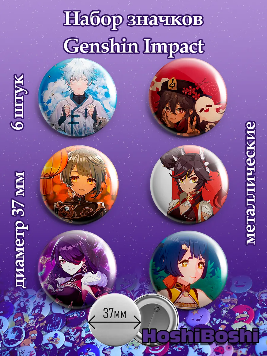 Набор из 6 металлических значков с изображениями из игры Геншин Импакт ( Genshin Impact ).