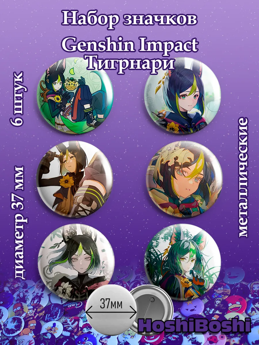Набор из 6 металлических значков с изображениями из игры Геншин Импакт ( Genshin Impact ).