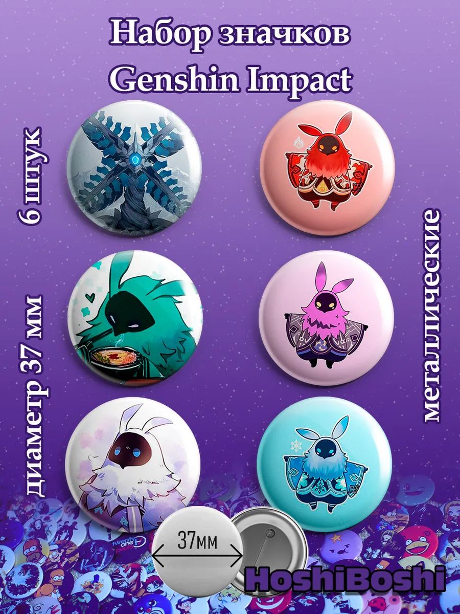 Набор из 6 металлических значков с изображениями из игры Геншин Импакт ( Genshin Impact ).