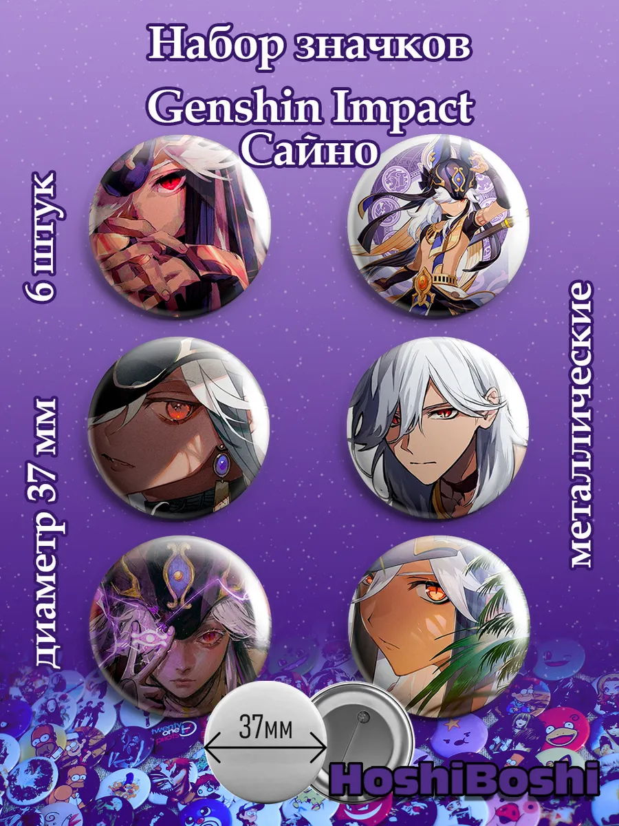 Набор из 6 металлических значков с изображениями из игры Геншин Импакт ( Genshin Impact ).