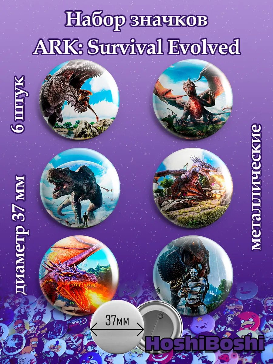 Набор из 6 металлических значков с изображениями из игры Арк Сурвивал ( ARK Survival Evolved ).