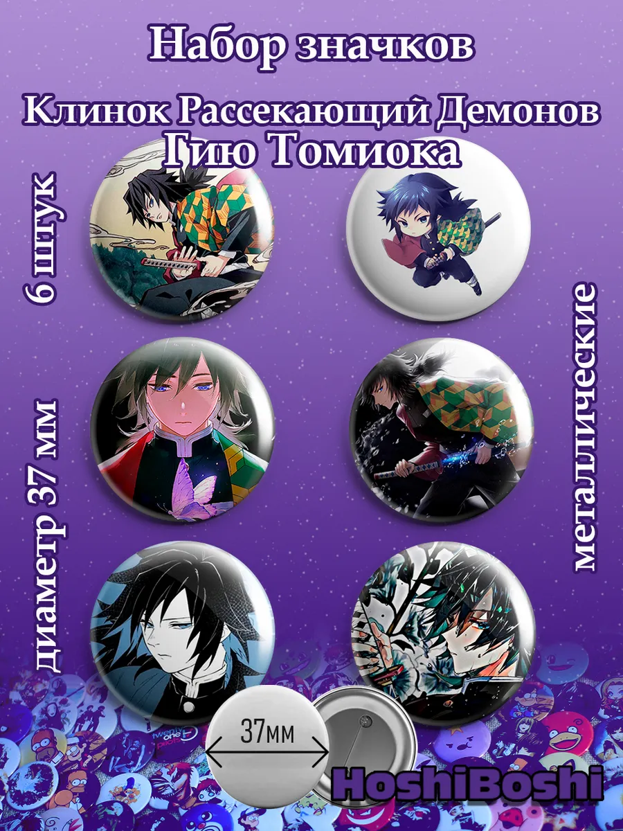 Набор из 6 металлических значков с изображениями из аниме Клинок Рассекающий Демонов ( Demon Slayer: Kimetsu no Yaiba ).