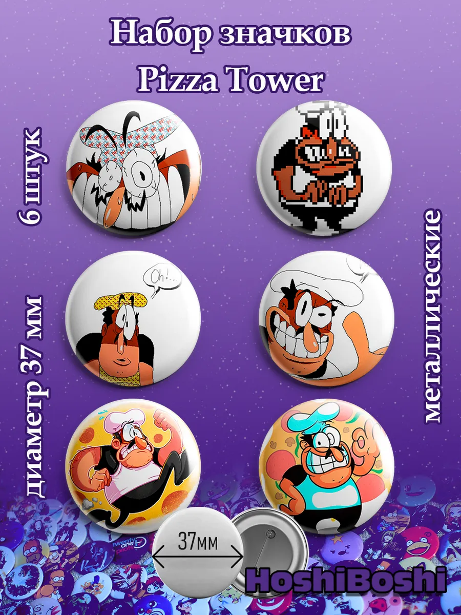 Набор из 6 металлических значков с изображениями с игрой Пицца Тауэр ( Pizza Tower ).