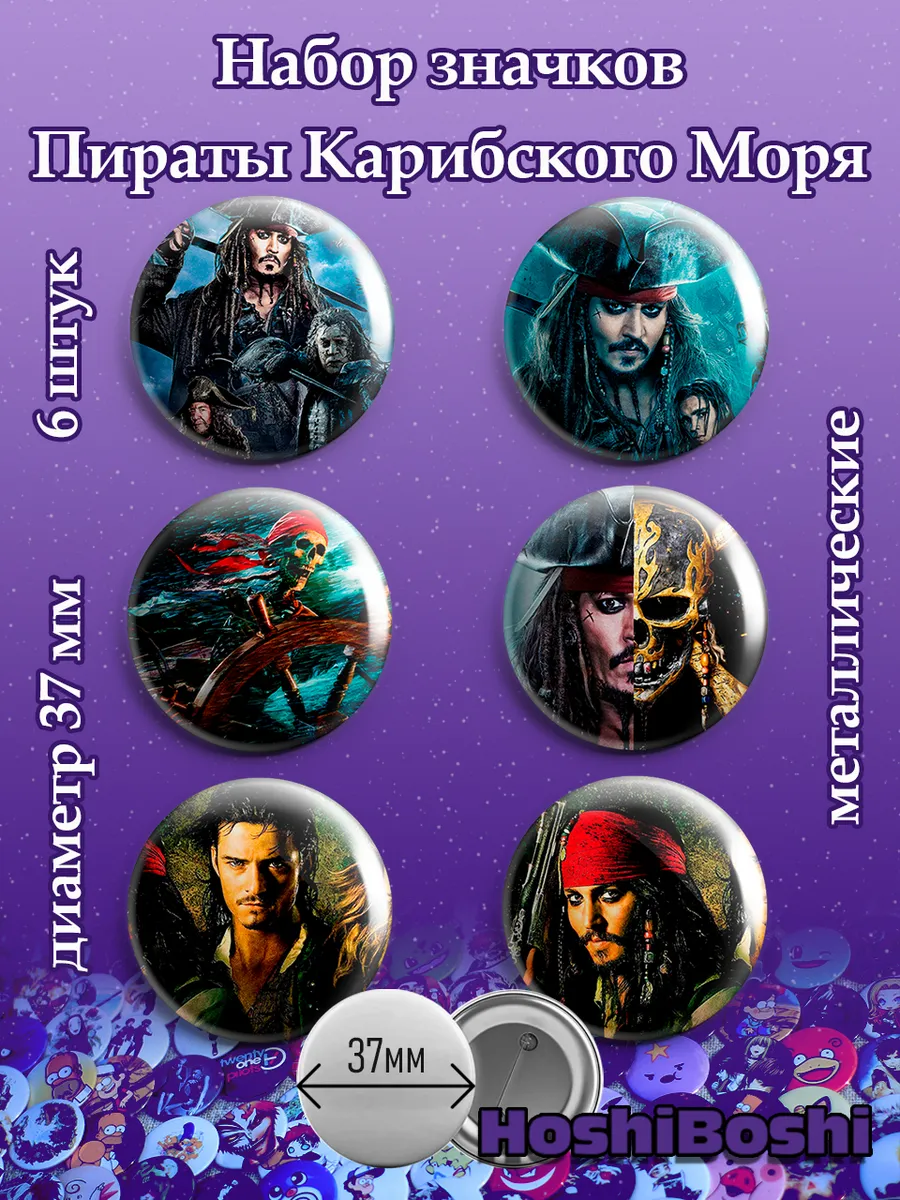 Набор из 6 металлических значков с изображениями из вселенной Пираты Карибского моря ( Pirates of the Caribbean ).