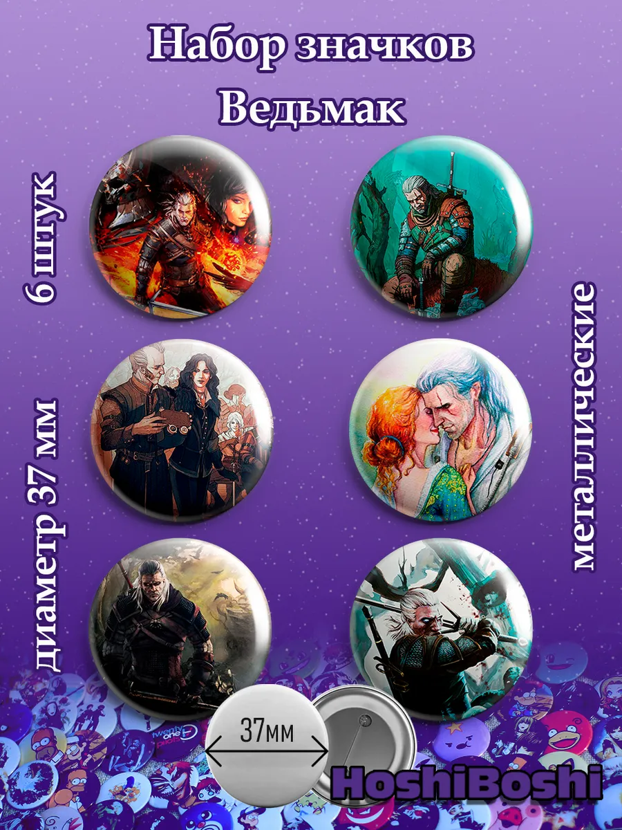Набор из 6 металлических значков с изображениями из игры Ведьмак ( The Witcher ).