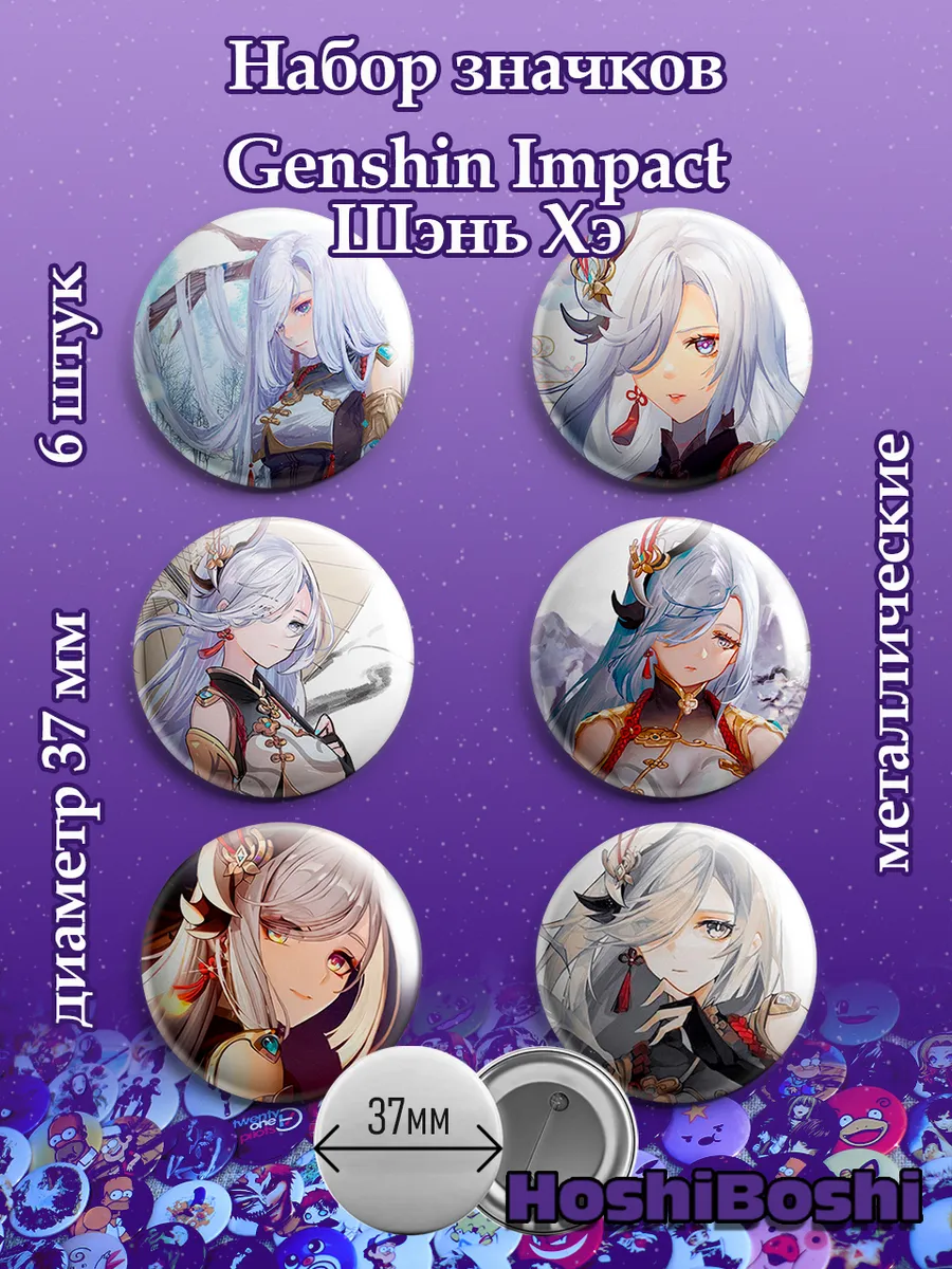 Набор из 6 металлических значков с изображениями из игры Геншин Импакт ( Genshin Impact ).