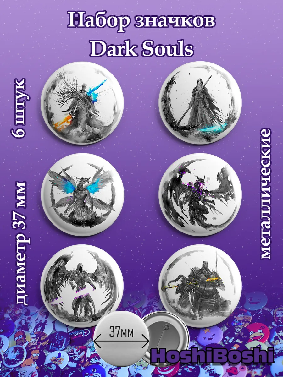 Набор из 6 металлических значков с изображениями из игры Дарк Соулс ( Dark Souls ).