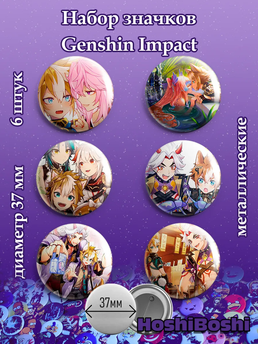 Набор из 6 металлических значков с изображениями из игры Геншин Импакт ( Genshin Impact ).