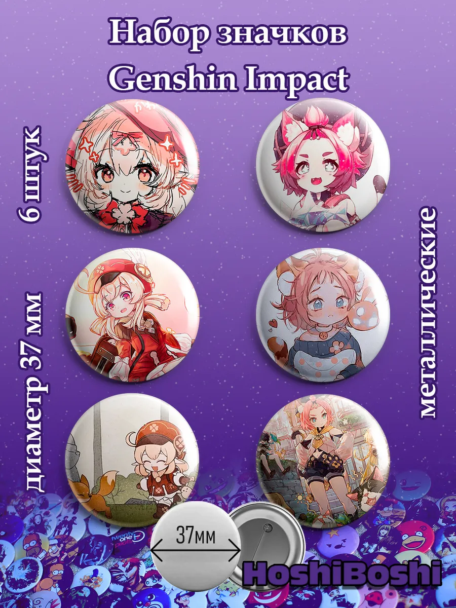 Набор из 6 металлических значков с изображениями из игры Геншин Импакт ( Genshin Impact ).