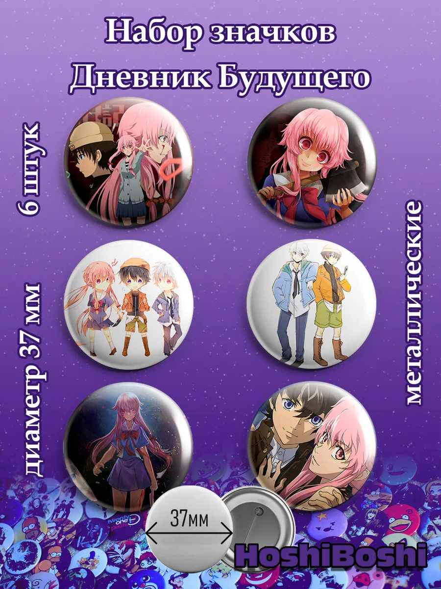 Набор из 6 металлических значков с изображениями из аниме Дневник Будущего ( Future Diary Mirai Nikki ).