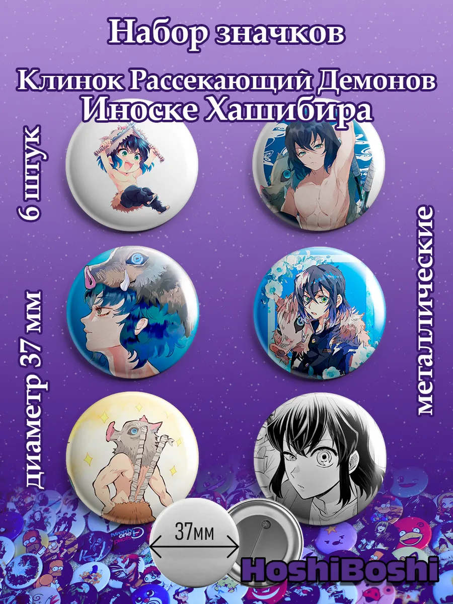 Набор из 6 металлических значков с изображениями из аниме Клинок Рассекающий Демонов ( Demon Slayer: Kimetsu no Yaiba ).