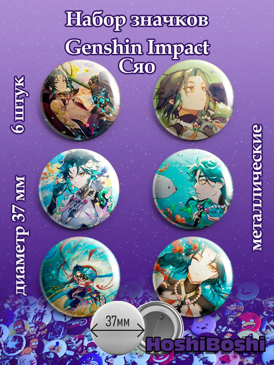 Набор из 6 металлических значков с изображениями из игры Геншин Импакт ( Genshin Impact ).