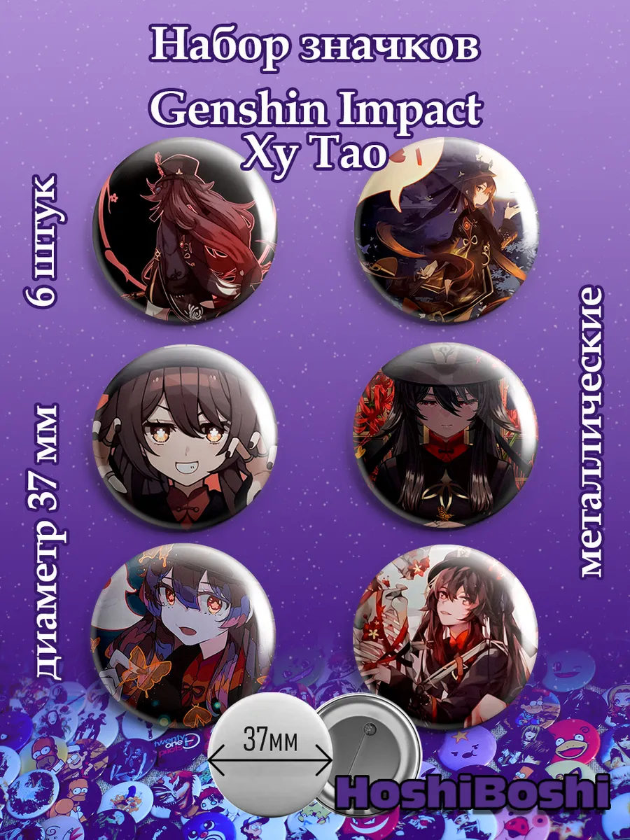 Набор из 6 металлических значков с изображениями из игры Геншин Импакт ( Genshin Impact ).