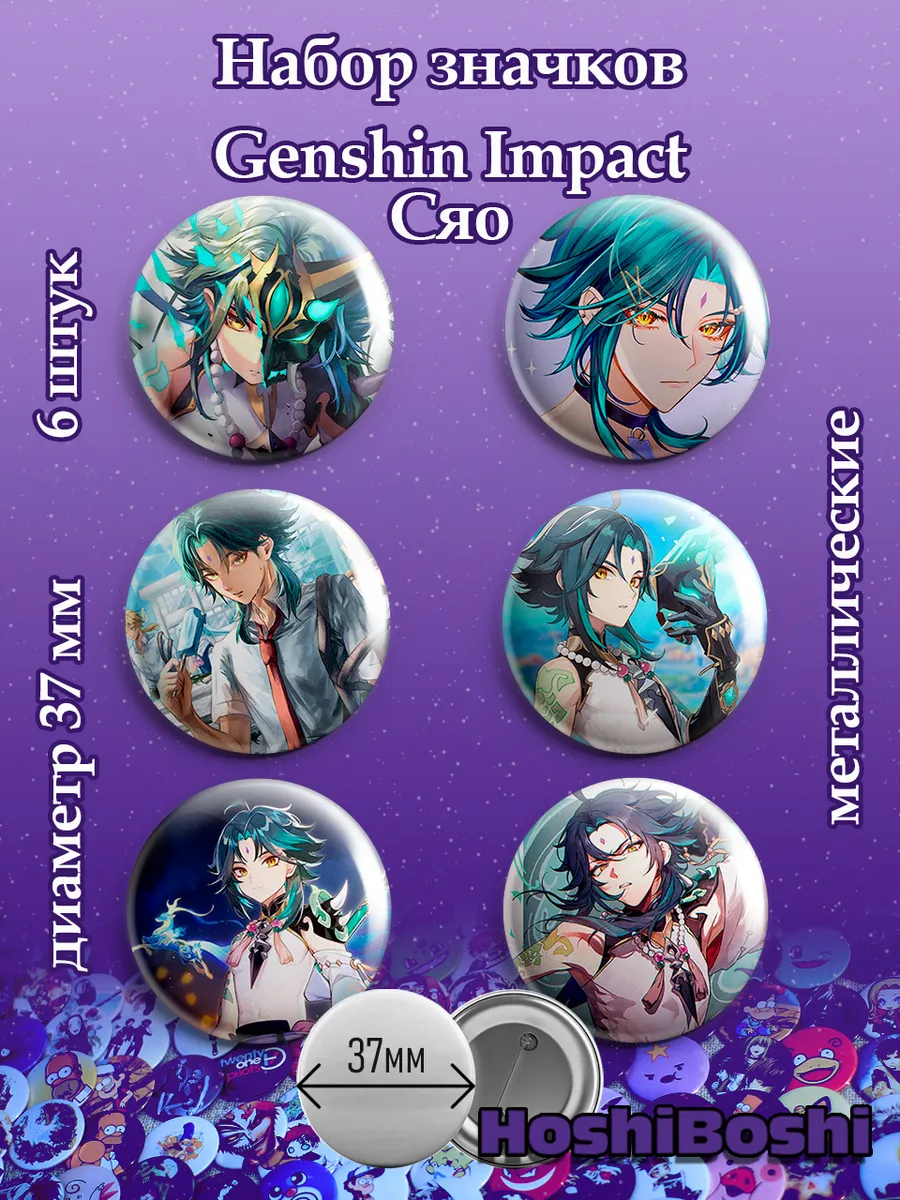 Набор из 6 металлических значков с изображениями из игры Геншин Импакт ( Genshin Impact ).